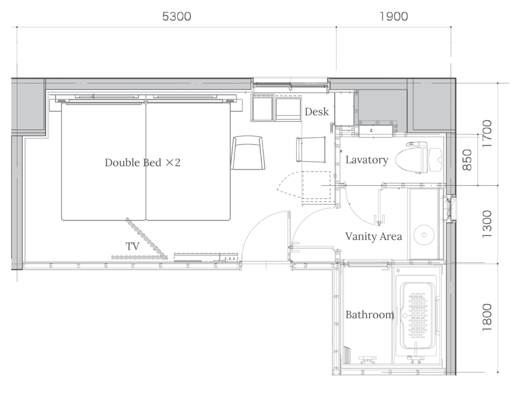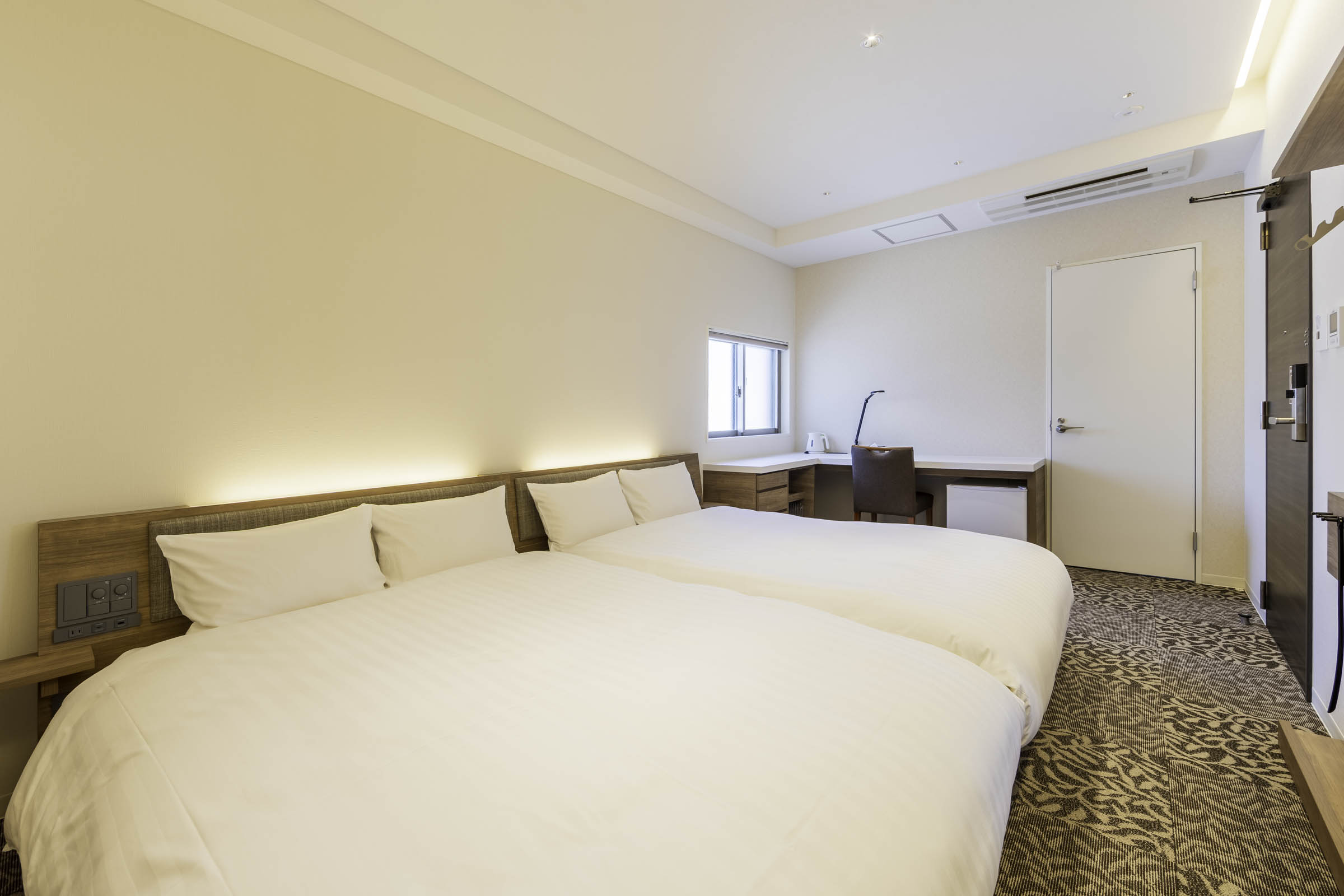 広々とした空間でゆったりとくつろげるデラックスツインルームは、特別なご滞在を求める方に最適です。ダブルベッド2台を備え、ご友人やご家族とのご宿泊にもぴったり。洗練されたインテリアと落ち着いた雰囲気が、旅の疲れを癒し、心地よいひとときを演出します。